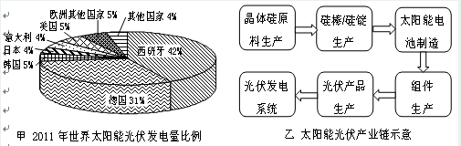 本题解析:试题分析:小题1:读图,图中资料表示的是太阳能光伏发电量比例大小,不是发电量大小。太阳能光伏发电产业是世界上增长最快的高新技术产业之一,发电量发达国家远超发展中国家是因为科技水平高。比如德国是温带海洋性气候,气候冷湿,光伏发电量比例高,并不是因为区域内太阳能资源丰富,A错。近年来太阳能光伏发电增长迅速是因为光伏发电是朝阳产业,前景光明,清洁无污染,是可再生能源,在未来能源结构中占的比重会逐渐增大。晶体硅一直是主要的光伏发电材料,B错。发达国家大力发展太阳能光伏发电,可以减少其它能源的消耗,减少污染气体排放,所以可以有效减轻碳排放的减排压力,但目前的技术还不可能 根本上解决能源短缺问题。C对、D错。