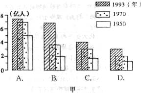 3、综合题 下面甲为1950~1993年部分大洲人口增长图,乙为1997年部分大洲人口增长指标表。读图和表,回答问题。