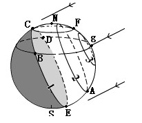 3、单选题 ??? 下图为北半球夏至时地球光照示意图,图中的圆圈1、2、3表示太阳高度等值线,其数值分别为0°、30°、60°;g点为太阳直射点,A点经度为120°E。读图回答1—2题。