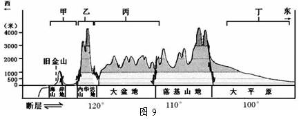 5、单选题 图3为“某大陆沿北纬38°线地形剖面图”,读图回答题。