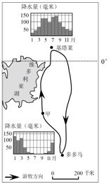 小题3:游牧主要是逐水草放牧,所以要随着雨带的移动而迁移。热带草原区的降水主要是受赤道低气压带影响,赤道低气压带随着太阳直射点南、北移动。所以理论上说,应该是12月22日移到最南端,然后向北移,次年3月21日移到赤道,所以推测图中在返回多多马的途中,到甲地时约为4月份,此时南半球雨季即将结束,草原生长量减小,北半球的雨季即将到来。所以B对。A、C、D错。