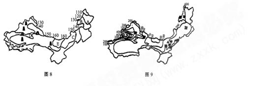 5、综合题 读下列图8“我国西北地区太阳辐射量分布图”.图9“我国西北地区年降水量分布图”和图10“我国西北地区土地状况图”回答: (16分)