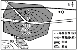 小题1:对图中M、N、P、Q四处房价及原因的推断最合理的是