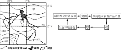本题解析:试题分析:小题1:材料2中反映的是土地荒漠化现象。所以①表示土地荒漠化,②表示过度放牧、过度开垦;受盛行风影响,该现象最有可能向南扩展。