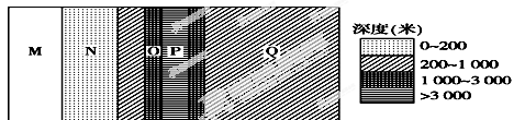 本题解析:试题分析:直接根据图示的海底深度分布判断,N处为浅海大陆架,埋藏着丰富的石油资源和天然气资源;O处为大陆坡;P处为海沟;Q处为海盆,广泛分布着锰结核。
