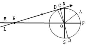 5、单选题 读下图为某日太阳光照射地球示意图。圆为地球,L为太阳光线,M为赤道平面,L与圆相切于点C,L与M交于点E。∠CEO=12°、∠COD=4°、∠AOF=40°。回答下列各题。