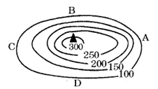 1、单选题 读图,从山峰向下望,将不能看见哪一点( )