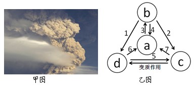 2、乙图为地壳物质循环示意图,代表此次火山活动的地质过程及形成的岩石可能是