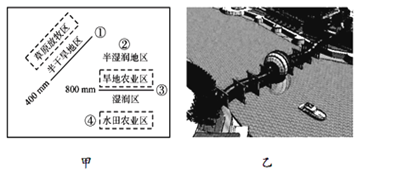 小题2:2009年8月份,地处中国南北地理分界线上的淮安市设立中国南北地理分界线标志园的项目,获得国家测绘局的批准,图乙为标志园内分界线标志物模型。该标志物应位于图甲中的(??? )