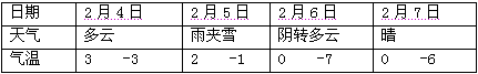 3、单选题 下表是我国某城市2月4日至7日的天气情况。(气温为白天最高气温和夜间最低气温,单位:℃)据此回答下列各题。