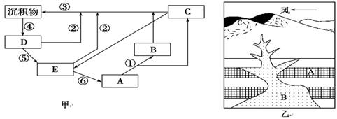 (3)在乙图中,A、B两处岩石中能找到化石的是?????????处,C处地貌名称是??????????,其形成的原因为??????????????????????。