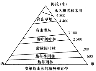 2、综合题  图为安第斯山某段的植被垂直带示意图,读图分析并回答下列问题。