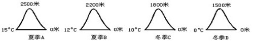 A.②地降水最多 B.只有③地的植被为森林 C.①地年均温度最低 D.②、③两地均受暖流影响 参考答案:小题1:C小题1:A 本题解析:考查自然带分布。小题1:①位于南回归线附近,应该是热带气候类型,大陆西岸受到寒流的影响降温减湿。形成热带荒漠带。故选C。小题1:①③均形成荒漠带,②地受到西风的影响,带来大量海洋水汽,气候湿润,降水最多。故选A。 本题难度:一般 3、综合题  读下图,完成下列问题:(去掉图中的专属经济区)(12分) 参考答案: 本题解析:试题分析: 本题难度:简单 4、单选题  读山地垂直自然带分布图,回答下列3个题。 参考答案:小题1:A 本题解析:小题1:本题考查山地垂直自然带谱的分布规律。山麓自然带主要取决于山体所处的纬度位置。所以本题选择A选项。 本题难度:简单 5、单选题  按气温垂直分布规律,下图中有永久性冰雪的山峰是 参考答案:B 本题解析: 本题难度:一般  |
