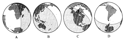 A.E点和F点都在赤道上 B.E点和F点都在回归线上 C.0点此时昼夜平分 D.AEB为昏线 |