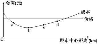 5、单选题 下图是“某工业产品价格或成本与距城市中心距离的相关曲线”图,据此回答小题。
