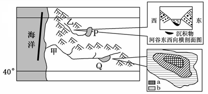 4、综合题 下图为“世界某区域简图”,图中右侧分别为“乙河流局部河谷剖面示意图”和“Q湖不同季节蓄水面积分布图”。读图回答问题。