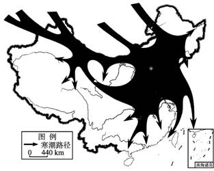 4、综合题 读“侵入我国寒潮途径图”,完成下列问题。