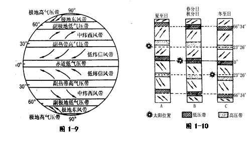 1.由于太阳辐射对各纬度加热不均,全球近地面形成七个气压带、六个风带,如图1-9所示。