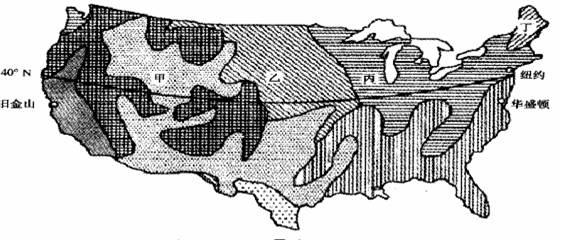 1.图中甲乙丙自然带的变化,其影响因素是2.在乙自然带中分布着美国一著名的农业带,该农业带形成的有利区位条件是