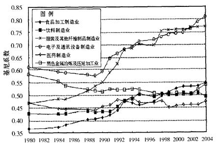 本题解析:1.本题考查地理图表的判读能力。根据图示曲线的变化,图中服装及其他纤维制品制造业的集中程度明显提高。所以本题选择C选项。