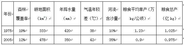 1.读表格资料,表中森林覆盖率下降,耕地面积增加,降水减少,气温年较差增大,河流含沙量增大。导致降水、气温、河流含沙量变化的因素,主要与森林减少,植被破坏有关。森林有调节气候,保持水土,涵养水源的作用,大面积的毁林开荒,导致森林的调节气候的功能降低,从而影响到粮食产量。C对。退耕还牧,水土流失减少,河流含沙量会减小,A错。年降水量减小,不会有水灾,B错。人口增长快与粮食产量 下降无关。D错。