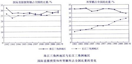 单选题 读该图“珠江三角洲与长江三角洲地区国际直接投资和外贸额所占全国比重的变化图”,回答问题: