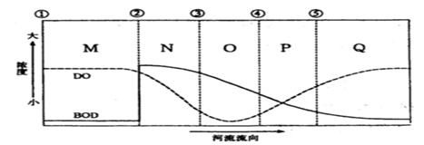 单选题 溶解氧DO是指溶解于水中的氧的含量,是衡量水质的重要指标。生化需氧量BOD是微生物分解水中的有机物体时需要消耗氧的数量,它用于监测水体有机物的污染状况。下图为某河由M河段至Q河段水中溶解氧和生化需氧量浓度变化曲线。据此完成小题。