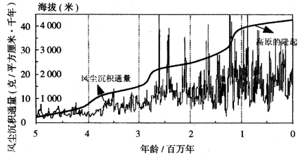 单选题 风尘沉积通量大小可以指示地区干燥度的变化。 下图反映了青藏高原隆起与西北地区的风尘沉积通量变化情况。读图回答下题。