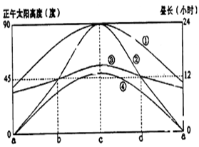 5、单选题 下图中①②③④表示北半球甲、乙两地正午太阳高度和昼长曲线,a、b、c、d表示二分、二至日,且甲地纬度高于乙地。据此回答下题。