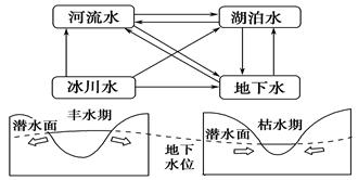 点评:本题难度较大,考查陆地水体类型及补给关系。陆地水体主要包括河流水、地下水、湖泊水及冰川水等类型,它们之间的补给关系如下所示: