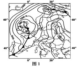 2、单选题 图1是2013年5月15日14:00欧洲部分地区海平面等压线分布图,图2是①、②两种气候类型的气温与降水量图。图2所示①、②气候类型与图1中甲、乙、丙、丁四地气候类型相符的有( )