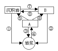 1.图中各数字代表某种地质作用,字母代表岩石类型,其中字母A、B和数字④分别代表2.图中与数字③相同的含义是