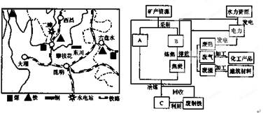 A.丰富的原料 B.庞大的市场 C.廉价的劳动力 D.先进的技术 参考答案:小题1:D 本题解析:小题1:本题考查工业区位。汇源果汁以水果为原料,需要接近原料产地,为原料指向型工业。可口可乐在生产过程中添加大量的水,产品重量增加很多,为市场指向型。所以本题选择D选项。 本题难度:简单 2、单选题 下列工业具有投入—产出联系的是 参考答案:D 本题解析:本题考查农业生产。面粉厂的产品是食品厂的原料。 本题难度:简单 3、单选题 被称为“亚洲硅谷”的城市是( ) 参考答案:D 本题解析:日本的九州岛被称为“硅岛”。 本题难度:简单 4、综合题 钢铁工业是四川省攀枝花市的主导工业部门。读“攀枝花市及其附近地区简图”和“以攀枝花钢铁工业为基础的生产流程模式图”,回答下列问题。 参考答案:(1)接近铁矿,原料丰富;接近煤矿区、水电站,能源丰富;水源 本题解析:本题考查我国的局部区域。(1)影响钢铁工业的区位条件主要从自然条件:水源、矿产资源和社会经济条件:市场、交通、科技、政策、劳动力、工农业基础等方面分析。(2)结合图示的生产流出分析。(3)该生产模式的优点主要从资料利用率、环境和经济效益等方面分析。(4)影响炼铜工业的主要因素为矿产资源和动力等。 本题难度:一般 5、单选题 读跨国石化企业在长三角的投资分布图,完成下列问题。 |