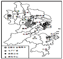 本题解析:试题分析:小题1:读图可知,生产厂家在江苏、上海、浙江均有分布;生产厂家是集中分布,空间差异较大;投资公司和研发中心主要集中在上海市,集中程度较高;生产厂家主要分布在城市周围。故选C。