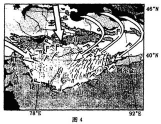 2、单选题 该图反映了塔里木盆地中沙尘暴形成时的风场状况,读图完成问题。