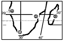 小题3:根据图示的海陆分布判断,④位于非洲南部好望角附近,著名的港口为开普敦港。