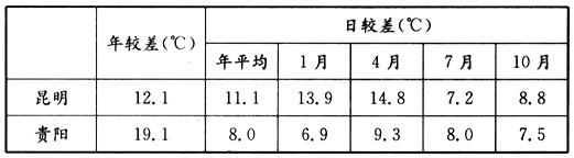 (1)根据资料一,比较昆明和贵阳气温年较差、日较差的差异。