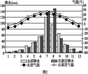 (1)石家庄与太原两城市纬度相仿、距离相邻,但气候差异比较大。两城市中全年各月气温偏低的是 ,主要原因是什么?(4分)