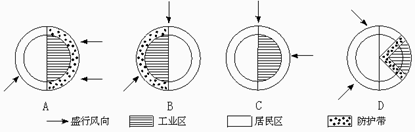 本题解析:本题考查城市的合理规划。工业区应位于主导风向的下风向或垂直郊外,较少对居民区的环境污染。ABC选项工业区都位于主导风向的上风向,工业污染影响居民区。D选项工业区位于常年盛行风向的下风向,并且与居民区有防护带隔离。所以本题选择D选项。