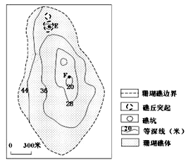 【小题2】图中F地等值线为20米,E地外围为礁坑,海拔较低,所以E处等值线数值应为36米, E地介于28米和36米之间,所以E、F两地的相对高度介于8米和16米之间,只有A项符合,A对。