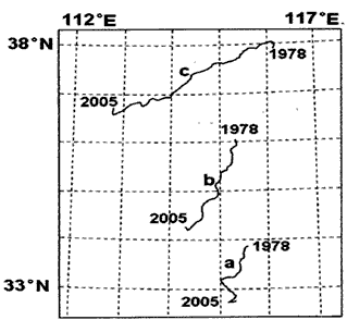 4、单选题 在地理研究中,可用重心移动反映地理事物和现象空间分布的变化,下图表示我国1978~2005年能源生产总量、能源消费总量与GDP重心变化轨迹。完成1—2题。