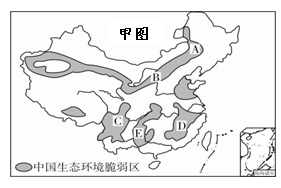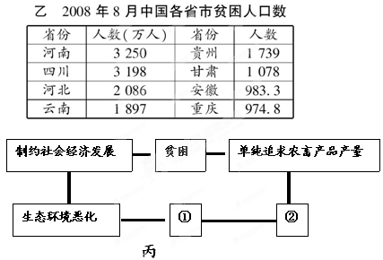3、综合题  (12分)甲图为中国生态环境脆弱区,乙表为近期我国部分省区贫困人口数量表。甲图和乙表的关联性体现如丙图所示。读图表,回答问题。