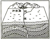本题解析:小题1:冲积扇是因为流水沉积作用形成的,所以AB错误。甲处岩层向上拱起,为背斜,断层右侧的岩层相对上升。所以本题选择C选项。
