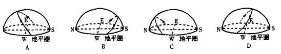 | 【小题2】6月22日,乙地看到太阳升落的视运动轨迹示意图为( )
