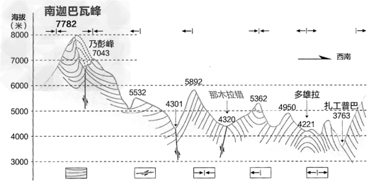 1、综合题 喜马拉雅山东段的南迦巴瓦峰地区位于板块碰撞的前缘,地壳变形极为。图中南迦瓦峰和乃彭峰间的虚线是假想岩层延续线。读图回答: