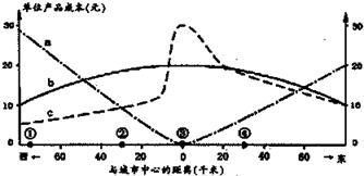 5、单选题 读某工业部门在某城市及其附近地区土地、运输和劳动力等成本曲线图。其中土地成本和运费都只与距城市中心的远近、交通通达度有关,回答32~33题。