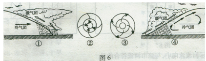 本题解析:1.图中①为冷锋,②为气旋,③为反气旋,④为暖锋。气象灾害与其形成的天气系统组合干旱—③;飓风—②;暴雨洪涝—④;寒潮—①。正确的是B。