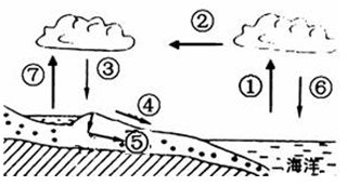 (1)由图上可知,①是指海洋水汽受热蒸发,②是将水汽输送到陆地;③是水汽遇冷形成降水;④是降水后,在地表形成了径流;⑤是地表水下渗到地表下面.