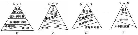 1.甲地西坡山麓植被一片枯黄时,甲乙丙丁四地昼长由长到短的 顺序是2.关于四幅山地垂直自然带分布位置的叙述,正确的是