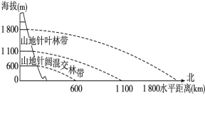 1.由图可知:从赤道向较高纬度地区,针叶林带在山地分布的海拔高度在逐渐降低。